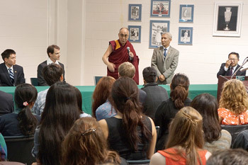Following his public talk, His Holiness met with a group of students from the University that included students from China. He told them that although the twentieth century, which he often characterizes as a period of bloodshed, is over, we shouldn’t think the twenty-first century will be without problems. The crucial point though will be to approach them differently. The only realistic way to resolve problems with others is through dialogue.