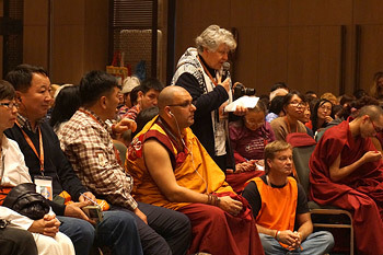 Finally, a questioner asked about receiving teachings over the internet. She wanted to know if she viewed teachings that were being webcast, whether she could feel she had received them fully. His Holiness answered that with regard to general teachings, of course you could receive them that way. With regard to tantric empowerments, he felt it could also be possible if the Lama concerned were aware that there were students participating in this way. He cited the precedent of remote ordination at the time of the Buddha. There were occasions when messages were sent in order that ordination could be conducted when, for various reasons, the Buddha was in one place and those seeking ordination were in another.