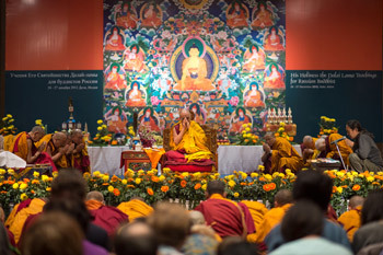 Arriving at the teaching venue, the Kempinski Ambience Hotel, His Holiness lost little time taking his seat and commencing the preparatory rituals for the Medicine Buddha permission he was going to give. Meanwhile the Heart Sutra was recited in Buryat, after which he asked the audience to recite the verses of chapter two and up to verse twenty-three of chapter three from the Guide to the Bodhisattva’s Way of Life, which constitute the Seven Branch Practice. Regarding the ceremony to generate the aspiring and engaging awakening minds of bodhichitta, he said that while it can be done before an image, it seems to be more effective if it is done before a mentor who also acts as a witness. He also clarified that the first two lines of the verse he would ask them to recite dealt with taking refuge in the Buddha, Dharma and Sangha and that the last two lines dealt with the aspiration to attain enlightenment. Then, reciting two verses from chapter three of the Guide involved generating the aspiring awakening mind and taking the bodhisattva vows.