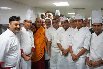 His Holiness the Dalai Lama with kitchen staff of the Kempinski Hotel, venue for his four day teaching to Russian Buddhists in Delhi, India, on December 25, 2012. Photo/Jeremy Russell/OHHDL