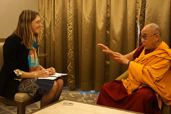 Olga Lipich of Russian television interviewing His Holiness the Dalai Lama in Delhi, India, on December 25, 2012. Photo/Jeremy Russell/OHHDL