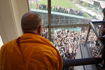 His Holiness the Dalai Lama looking at the many hundreds waiting outside of the capacity filled Lincoln Center before his teachings in New York City on October 21, 2012. Photo/Jeremy Russell/OHHDL