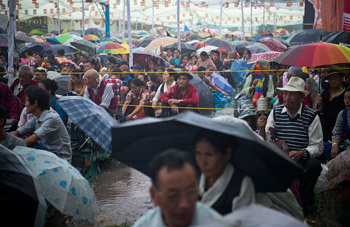 Members of the audience braving the rainy weather during teachings by His Holiness the Dalai Lama at Norling Park, Dekyiling Tibetan Settlement near Dehra Dun, India, on September 14, 2012. Photo/Tenzin Choejor/OHHDL