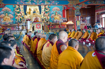 His Holiness the Dalai Lama speaking at Drikung Shedra in Dekyiling Tibetan Settlement near Dehra Dun, India, on September 14, 2012. Photo/Tenzin Choejor/OHHDL