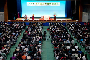 Before His Holiness began speaking, local artists presented two beautifully choreographed dances reflecting the Okinawan culture. The audience sat mesmerized by the delicate movements of the female dancers who wore intricate dresses and headgear.
