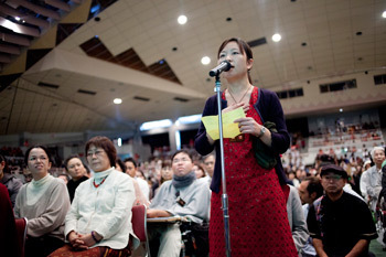 A member of the audience asking His Holiness the Dalai Lama a question during his public talk in Okinawa, Japan, on November 11, 2012. Photo/Office of Tibet Japan