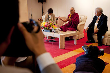 His Holiness the Dalai Lama speaking to members of the media during his visit to Okinawa, Japan, on November 12, 2012. Photo/Office of Tibet Japan