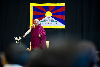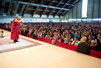 | His Holiness the Dalai Lama greeting the audience before his talk "Art of Happiness" in Klagenfurt, Austria, on May 20, 2012. Photo/Tenzin Choejor/OHHDL |