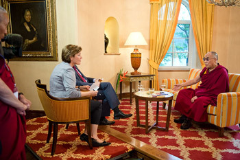 Doris Appel head of the Religion Department of ORF-TV, interviews His Holiness the Dalai Lama in Klagenfurt, Austria, on May 20, 2012. Photo/Tenzin Choejor/OHHDL