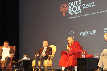 His Holiness the Dalai Lama and fellow panelists at the "Out of Box Conference" in Maribor, Slovenia, on May 16, 2012. Photo/Tenzin Taklha/OHHDL