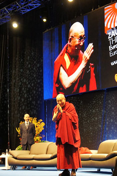 His Holiness the Dalai Lama greeting the audience before his public talk "Cultivating Peace of Mind" in Maribor, Slovenia, on May 16, 2012. Photo/Tenzin Taklha/OHHDL |