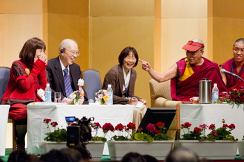 As the program moved to a conclusion, His Holiness stressed how happy he was that such a discussion was taking place in Japan. “Your land is not very big, but people are quite smart, hard-working. After the Second World War, your whole country was devastated, but you built a new one out of the ashes, though your determination, your hard work. Please pay some attention to inner value.”