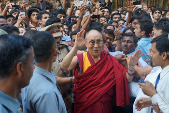 | His Holiness the Dalai Lama is greeted by a large