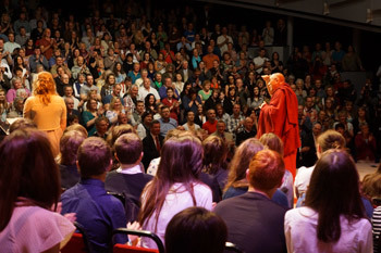 His Holiness the Dalai Lama greeting the audience before his talk at Eden Court Theatre in Inverness, Scotland, on June 23, 2012. Photo/Jeremy Russell/OHHDL