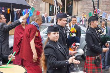 A pipe and drum band plays for His Holiness the Dalai Lama as he departs from Eden Court Theatre after his talk in Inverness, Scotland, on June 23, 2012. Photo/Jeremy/Russell/OHHDL
