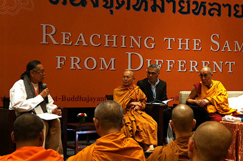 Words of welcome and respect were pronounced by a lady representative of the Buddhadasa Indapanno Archive that was influential in organizing the occasion. She mentioned His Holiness’s having been a spiritual friend to two Thai Elders and expressed the wish that relations between the Thai and Tibetan traditions should continue to flourish. She said the purpose of the dialogue was to strengthen faith in the Dharma; reinforce relations between Thais and Tibetans and to promote other beneficial activities.