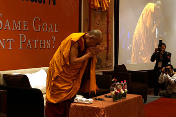 A short film clip showing His Holiness’s second visit to Thailand in 1972 was shown, following which a message from the Thai Sangharaja, who is 100 years old, was read. He pointed out that this meeting was very much in accordance with tradition from the time of the Buddha. He noted that the Buddha was remarkably open-minded and ready to listen to others, only offering his own views when invited to do so. While Buddhism has taken on different forms in different places, these differences should not be thought of as grounds for unthinking discrimination, but should encourage us to come together in dialogue to eliminate misunderstanding.