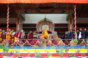 Leh, Ladakh, J&K, India, 5 August 2012 - His Holiness arrived at the teaching ground early for the second day of teachings today, walking from the Shiwatsel Phodrang to the new teaching pavilion. He said he would begin the explanation of the texts and that yesterday’s session had been more of an introductory talk. He also explained that tomorrow he would conduct the ceremonies for giving the lay-person’s precepts, generating the aspiration to enlightenment and the Bodhisattva vows, as well as an Avalokiteshvara empowerment.