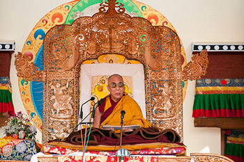 His Holiness the Dalai Lama speaking during his second day of teachings in Leh, Ladakh, J&K, India, on August 5, 2012. Photo/Namgyal AV Archive