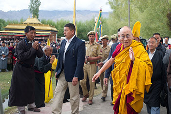 His Holiness the Dalai Lama waves to well-wishers as he leaves after the second day of teachings in Leh, Ladakh, J&K, India, on August 5, 2012. Photo/Namgyal AV Archive
