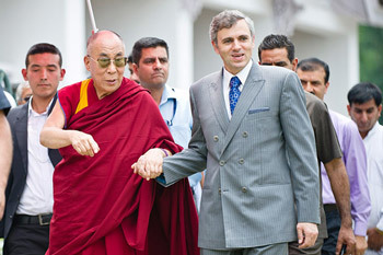 Tourism & Culture Minister, Mr Nawang Rinzin Jora, expressed his admiration that despite losing his own country His Holiness has been a tireless champion of peace and non-violence throughout the world. He thanked those who had invited him to Kashmir and then thanked His Holiness for coming. Chief Minister Omar Abdullah noted that 24 years have passed since His Holiness last came to Kashmir, a visit he remembers vividly, although he was young when he came to meet him with his father,