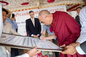 His Holiness the Dalai Lama signing a pledge by the students of Tibetan Public School to follow His Holiness' example of promoting human values and religious harmony during his visit to Srinagar, J&K State, India, on July 14, 2012. Photo/Tenzin Choejor/OHHDL