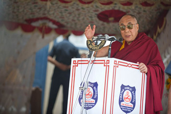 His Holiness the Dalai Lama speaking at the Tibetan Public School in Srinagar, J&K State, India on July 14, 2012. Photo/Tenzin Choejor/OHHDL