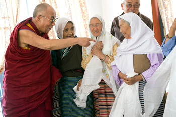 His Holiness the Dalai Lama interacting with some of the elders of the Tibetan Muslim community who escaped from Tibet in 1959/1960 during his visit to the Tibetan Public School in Srinagar, J&K state, India on July 14, 2012. Photo/Tenzin Choejor/OHHDL
