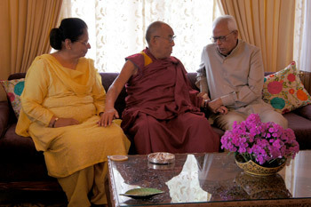 His Holiness the Dalai Lama during the courtesy call he made to His Excellency Shri N.N. Vohra, Governor of Jammu & Kashmir state, India and his wife at Raj Bhawan, in Srinagar, J&K state, India on July 14, 2012. Photo/Tenzin Taklha/OHHDL