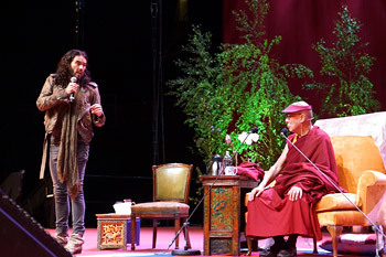 Comedian Russell Brand introduces His Holiness the Dalai Lama at the start of the youth event "Stand Up and Be the Change" in Manchester, England, on June 16, 2012. Photo/Jeremy Russell/OHHDL
