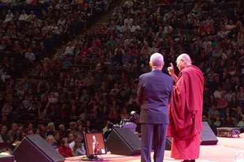 In the afternoon, His Holiness drove to the Manchester arena, where backstage he met Russell Brand, the popular comedian who was to introduce him to the 10,000 strong audience. This he did with boisterous aplomb, but before asking His Holiness to speak, invited him and the audience to watch two video messages from His Holiness’s friends and fellow Nobel Peace Laureates Guatamalan Mayan Rigoberta Menchu and South African Bishop Desmond Tutu.