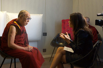 His Holiness the Dalai Lama being interviewed for Italian broadcaster TGI in Milan, Italy, on June 27, 2012. Photo/Jeremy Russell/OHHDL |