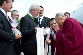 His Holiness the Dalai Lama is greeted by Governor Gerhard Doerfler of Carinthia on his arrival at the airport in Klagenfurt, Austria, on May 17, 2012. Photo/Tenzin Choejor/OHHDL