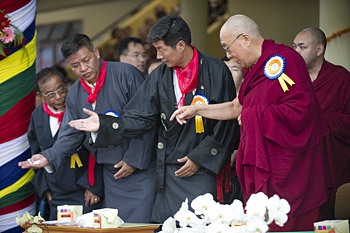 Tibetan Parilament in Exile Speaker Penpa Tsering and head of the Central Tibetan Administration Dr Lobsang Sangey welcome His Holiness the Dalai Lama at the start of celebrations in honor of his 77th birthday in Dharamsala, India, on July 6, 2012. Photo/Tenzin Choejor/OHHDL |