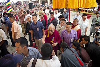 | His Holiness the Dalai Lama is greeted by well-wishes on his arrival at the Main Tibetan Temple at the start of celebrations in honor of his 77th birthday in Dharamsala, India, on July 6, 2012. Photo/Tenzin Choejor/OHHDL |