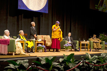 His Holiness the Dalai Lama speaking during the interfaith gathering on "Spirituality and the Environment" in Portland, Oregon on May 9, 2013. Photo/Don Farber