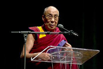 His Holiness the Dalai Lama speaking during his talk at the University of Portland in Portland, Oregon on May 9, 2013. Photo/Don Farber