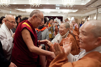 Tokyo, Japan, 26 November 2013 - On the final morning of this visit to Japan, His Holiness the Dalai Lama met with a group of 300 Buddhists, who had come from Korea to meet him. He greeted them warmly: