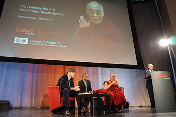 His Holiness the Dalai Lama is introduced before speaking at the European Academy in Bolzano, South Tyrol, Italy, on April 10, 2013. Photo/Jeremy Russell/OHHDL