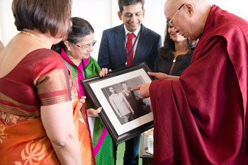 New Delhi, India, 1 December 2013 - The Birla Institute of Management Technology (BIMTECH) invited His Holiness the Dalai Lama to address a select gathering of corporate leaders, civil servants, academicians, professionals, and diplomats today as part of its 25th anniversary celebrations. The event took place at the Jaypee Integrated Sports Complex, Greater Noida. His Holiness’s relations with the Birla family go back to the early days of his life in India. It was in their house in Mussoorie that he spent his first year in exile before moving to Dharamsala. In a brief meeting before his talk, he was presented with a framed photograph of himself with Mr & Mrs BK Birla on the veranda of Birla House in 1959 or 1960.
