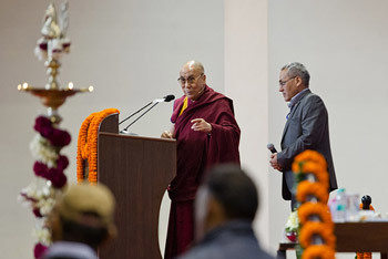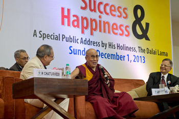 His Holiness the Dalai Lama speaking on "Success & Happiness" as part of Birla Insitute of Management Technology's 25th anniversary celebrations in Noida, India on December 1, 2013. Photo/Tenzin Choejor/OHHDL
