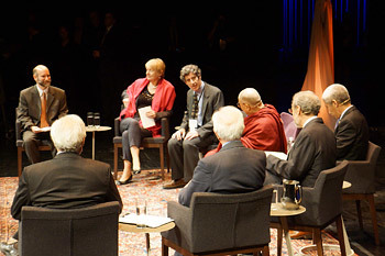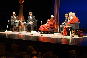 His Holiness the Dalai Lama and fellow panelists during the morning session of the Change Your Mind, Change the World discussions at the Overture Center in Madison, Wisconsin on May 15, 2013. Photo/Jeremy Russell/OHHDL
