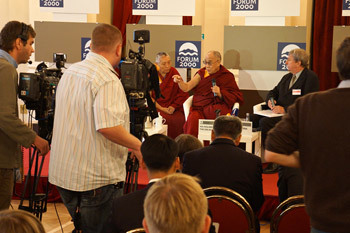 Prague, Czech Republic - 17 September 2013 - Arriving at the Zofin Palace this morning, His Holiness the Dalai Lama was received by Tomáš Vrba, a publisher who is Chairman of the Forum 2000 Board of Directors. He escorted him to a meeting with the press in the Knights’ Hall. His Holiness answered the first question about whether he is disappointed when political leaders are reluctant to meet him by repeating what he has said elsewhere that he is primarily concerned with meeting the public to discuss human values with them.