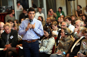 An audience member asking a question of panelists during the final session of the 17th Forum 2000 Conference at Zofin Palace in Prague, Czech Republic on September 17, 2013. Photo/Forum2000/Ondrej Besperat