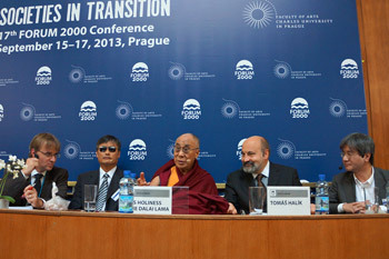 His Holiness the Dalai Lama and fellow panelists during the final session of the 17th Forum 2000 Conference at Zofin Palace in Prague, Czech Republic on September 17, 2013. Photo/Igor/SaveTibetRussia