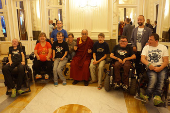 His Holiness the Dalai Lama with a group of physically challenged young people who play music together on his arrival at the Tipsport Arena before the start of his talk in Prague, Czech Republic on September 14, 2013. Photo/Jeremy Russell/OHHDL
