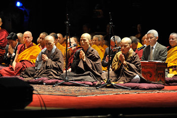 New York, USA, 19 October 2013 - For the second day, today, Rato Khenpo Nicholas Vreeland, with incense in hand, escorted His Holiness the Dalai Lama onto the stage of the Beacon Theater, New York. Once His Holiness had greeted members of the Sangha, performed prostrations to the Buddha, saluted the audience and taken his seat on the throne, a group of Chinese monastics recited the Heart Sutra in Chinese. He began with the remark that there is a verse at the end of the Heart Sutra that encapsulates the practice of the Dharma: