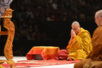 Because Atisha has written that someone receiving the Bodhisattva Vows should hold at least some personal liberation or pratimoksha vows, His Holiness first went through the ceremony for giving the layperson’s precepts. As a preliminary to generating the awakening mind he asked the entire audience to recite the Seven Branch practice contained in chapters two and three of Shantideva’s ‘Guide to the Bodhisattva’s Way of Life’. Following that ceremony he gave the Bodhisattva Vows.