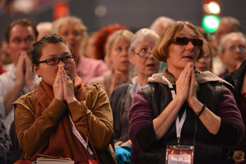 Members of the audience reciting vows during His Holiness the Dalai Lama's last day of teachings at the Sydney Entertainment Centre in Sydney, Australia on June 16, 2013. Photo/Rusty Stewart/DLIA 2013
