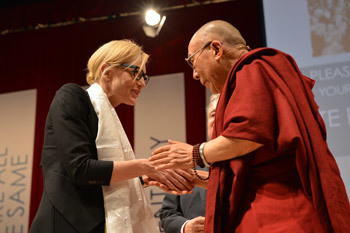 His Holiness the Dalai Lama thanking actress Cate Blanchett after her introduction to his public talk in Sydney, Australia on June 16, 2013. Photo/Rusty Stewart/DLIA 2013